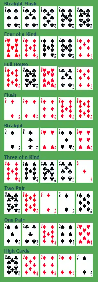 نمودار مقابل به ترتیب شامل بهترین دست یعنی «تاپ استریت (ردیف) فلاش» (Royal Flush) تا بدترین دست ممکن «بش» (High Card) است که در بازی پوکر مورد استفاده قرار میگیرد. این ترتیب در روش ۵ برگی که در ایران مرسوم است کمی متفاوت است. در پوکر پنج برگی سه عدد از یک ورق از استریت برتر است و رنگ هم دست بهتری از فول میباشد. همچنین در بسیاری موارد در پوکر ۵ کارتی از تمام ورقها استفاده نمیشود و برای نمونه در بازی با شرکت ۵ نفر از کارتهای کمتر از ۶ استفاده نمیشود