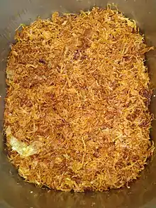 پیاز را روی حرارت ملایم در روغن تفت میدهند تا طلایی شود. سپس روغن آن را میگیرند و خنک میکنند، زمان تقریبی درست کردن آن هم بین ۳۰ الی ۴۵ دقیقه طول میکشد.