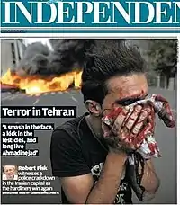 روزنامهٔ ایندیپندنت در همان روز عنوان «ترور در تهران» را برای خبر صفحه اول خود برگزید و در کنار تصویر برزگی از یک جوان معترض که با دستان خونین صورت خونآلود خود را در پارچهای گرفتهاست، نوشت: «یک ضربهٔ محکم به صورت، یک لگد در بیضهها و زندهباد احمدینژاد». رابرت فیسک، یکی از تحلیلگران روزنامهٔ ایندیپندنت، در گزارش مفصلی از تهران نوشت که چگونه شاهد حملات پلیس به تظاهرکنندگان بودهاست که در موارد متعدد با باتوم به صورت جوانان بازداشتشده میزدند، سپس اقدام به لگدزدن به ناحیهٔ بیضتین آنها میکردند.