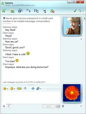 ![]() پنجرهٔ گفتگوی پیامرسان ویندوز لایو ۸٫۵ | |