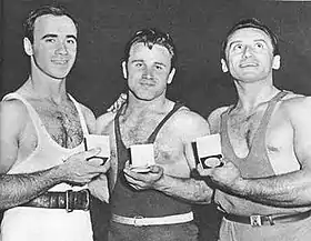 ![]() Pete George, Fyodor Bogdanovsky and Ermanno Pignatti compare hardware in 1956 in Melbourne. | |||||||||||||||||||||||||