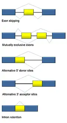 - مشارکتکنندگان ویکیپدیا. «Alternative splicing». در دانشنامهٔ ویکیپدیای انگلیسی، بازبینیشده در ۹ فوریه ۲۰۲۱.