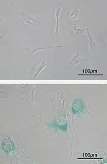 تصویر پایین: سلولهای امایاف پس از رسیدن به حد هایفلیک (پیرشدگی سلول). همانطور که در تصویر نمایش داده شدهاست، سلولها به مراتب بیشتر رشد کردهاند و بزرگتر و پهنتر به نظر میرسند. بخشهای آبی نشان دهنده گلاکتوزیسس-بتای تولید شده در سلول است. گلاکتوزیسس-بتا آنزیمی است که در مرحلهٔ پیرشدگی سلول شکل میگیرد.