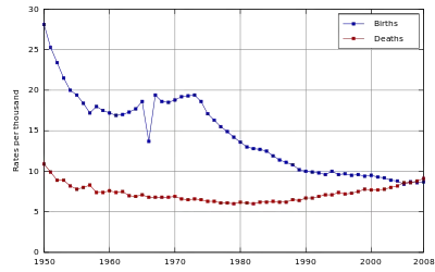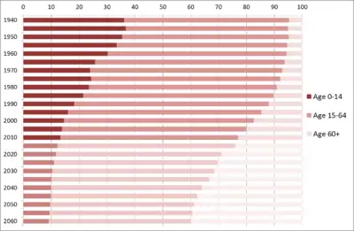 امید به زندگی در بدو تولد از پایان جنگ جهانی دوم، که بهطور متوسط برای زنان ۵۴ سال و برای مردان ۵۰ سال بود، به عنوان یک نتیجه از بهبود دارو و تغذیه، به سرعت افزایش یافتهاست و درصد جمعیت ۶۵ سال به بالا بهطور پیوسته از دهه ۱۹۵۰ افزایش یافتهاست.