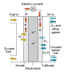 پروتون به وجود آمده از محیط الکترولیت گذر کرده و الکترون در فضای مدار باقی می ماند و باعث ایجاد جریان می شود. در قطب کاتد اکسیژن با یون و الکترون واکنش نشان داده و تولید آب و حرارت می کند.