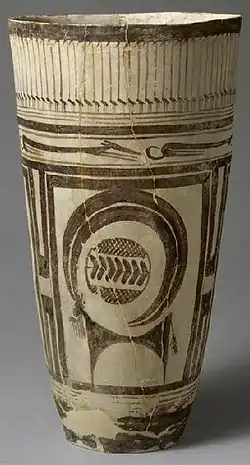 پیمانه با نقش بز کوهی ظرفی نسبتاً بزرگ و منقش است که به شکل مجللی تزئین شده است. این پیمانه در میان اشیاء مربوط به مراسم تدفین در تمدن شوش کشف شده است. دیواره این ظرف نازک است و پرندگانی شبیه لکلک در بالا نزدیک به لبه، گرداگرد آن نقاشی شدهاند. به نظر میرسد این پیمانه برای نخستین مبادلات محصولات کشاورزی در تمدنهای شرقی استفاده می شدهاست. در پایین پرندگان نقش سگهایی با نژاد خاص که نسبتاً طویل میباشند پیمانه را آراستهاند. باریکههای پر پیچ خم نیز در روی پیمانه منقوش هستند. نقش اصلی ظرف نیز طرح بز کوهی است.