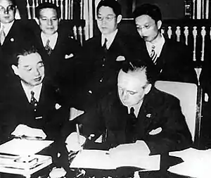 ![]() سفیر ژاپن در آلمان Kintomo Mushakoji و وزیر خارجه آلمان یواخیم فون ریبنتروپ، در حال امضای پیمان. | |