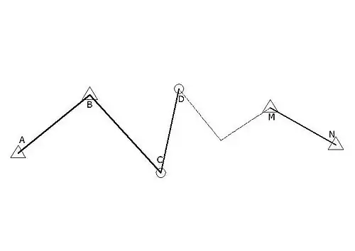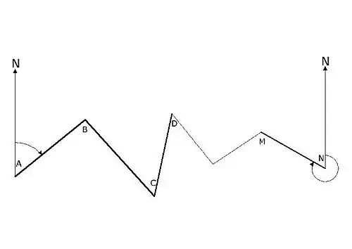- ب-آزیموت جغرا فیایی امتداد شروع(AB)وآزیموت جغرافیایی امتداد پایان پیمایش(MN)را مستقیماًاندازهگیری میکنیم.یکبار نیز آزیموت امتداد NMرا با توجه به زوایای خوانده شده در حین پیمایش، محاسبه کرده ونتیجه را با آزیموت اندازهگیری شده مقایسه مینماییم.شکل زیر: