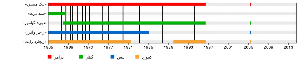 ![]() پینک فلوید در ژانویه ۱۹۶۸، یکی از معدود تصاویری که هر پنج عضو گروه در کنار هم ایستادهاند. ساعتگرد از پایین: گیلمور، میسن، بَرِت، واترز، رایت | |