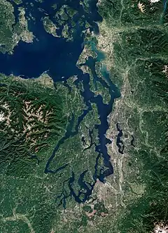 ![]() تصاویر ماهواره ای پیوجت ساند، گرفته شده توسط ماهواره سنتینل-۲ در سال ۲۰۱۸ | |