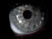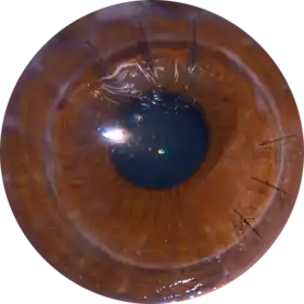 ![]() پیوند قرنیه پس از یک سال از درمان، شش بخیه قابل مشاهده هستند | |