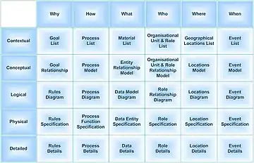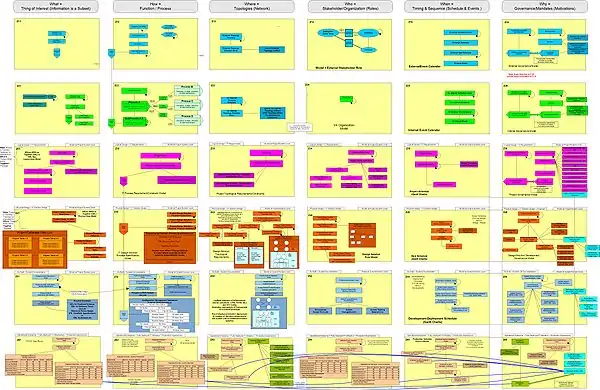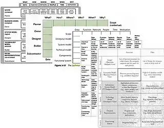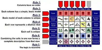 چارچوب، یک ساختار منطقی برای طبقهبندی و سازماندهی نمایش توصیفی از یک سازمان است. این ساختار هم برای مدیریت سازمان و هم برای عوامل درگیر در توسعه سیستمهای سازمان حائز اهمیت است.[2] در حالی که هیچ ترتیب اولویتی برای ستونهای چارچوب وجود ندارد، ترتیب بالا به پایین سطرها برای تنظیم مفاهیم کسب و کار و سازمان فیزیکی واقعی مهم است. سطح جزئیات در چارچوب، یک تابع از هر سلول (و نه سطرها) است.