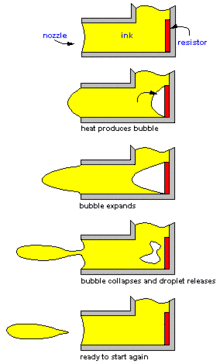 - این حباب از سوراخ ریزی که در جلوی نازل ایجاد شده به بیرون پرتاب میشود که طبیعتاً قدرت پرتاب آن نسبت به پیزو الکتریک کمتر بوده (عیب این روش) و جوهر پرتاب شده از ان خیلی سریع خشک میشود (امتیاز این روش)