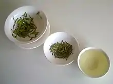 ![]() ۳ نمونه مختلف چای سبز: (از چپ به راست) برگهای خشک، برگهای تر، و به صورت مایع. (برگهای تر از برگهای خشک سبزتراند) | |