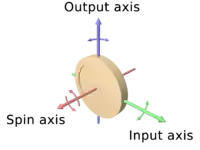 محور چرخ دوار محور چرخش را تعریف میکند. حلقه داخلی دو درجه آزادی چرخش دارد و محورش هم یک درجه آزادی دارد. روتور برای چرخش به محوری متصل است که همیشه به محور حلقه داخلی عمود است؛ بنابراین روتور سه درجه آزادی چرخش دارد و محورش هم دو درجه دارد. چرخ به نیروی وارد بر محور ورودی با نیروی عکسالعمل به محور خروجی پاسخ میدهد.