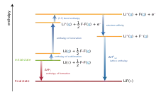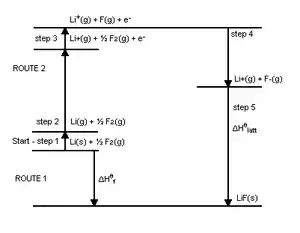 آنتالپی تشکیل لیتیوم فلوراید (LiF) از عناصر آن لیتیوم و فلوئور به اشکال پایدار آنها در پنج مرحله در نمودار مدل شده است:
