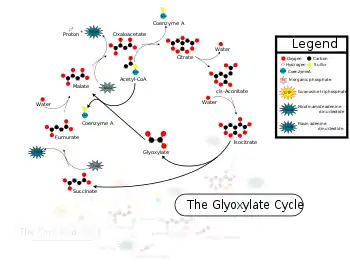چرخه گلیاگزالات مراحلی از چرخه اسید سیتریک را دور میزند که در آن کربن به شکل CO2 از بین میرود. دو مرحله نخستین چرخه گلیاگزالات مانند چرخه اسید سیتریک هستند: استات ← سیترات ← ایزوسیترات. در مرحله بعدی، ایزوسیترات توسط نخستین آنزیم چرخه گلیاگزالات که ایزوسیترات لیاز است به سوکسینات و گلیاگزالات (نام چرخه از نام این ماده گرفته شدهاست) تجزیه میشود. مالات سنتاز، گلیاگزالات با استیل-کوآ را ترکیب میکند تا مالات به دست آید. مالات و اگزالواستات میتوانند توسط نخستین آنزیم نوگلوکززایی یعنی فسفوئنولپیرووات کربوکسیکیناز، به فسفوئنولپیرووات تبدیل شوند. نتیجه خالص چرخه گلیاگزالات تولید گلوکز از اسیدهای چرب است. سوکسینات تولید شده در مرحله نخست میتواند وارد چرخه اسید سیتریک شود تا در پایان اگزالواستات تشکیل شود.[2]