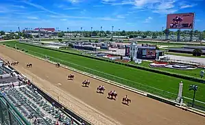 یک اسبسوار در حین مسابقه در مجموعهٔ چرچیل داونز.