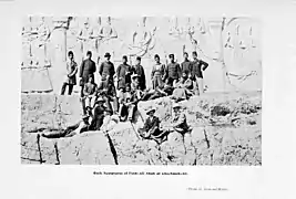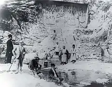 خشک کردن فرشها بر روی تپه سنگی چشمه علی ۱۳۳۹ خورشیدی - دو توریست زن آمریکایی در حال بالا رفتن از پلکان سنگی کنار سنگنگاره فتحعلیشاه