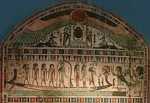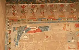 ![]() چشم رع که به صورت قرص خورشیدی محاط به دو کبرای حلقه شده با تاجهای سفید و قرمز، به نشانه مصر علیا و سفلی، تصویر شدهاست. | |