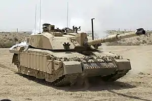 ![]() یک تانک چلنجر دو در حال گشت در بیرون بصره ، عراق ، در زمان عملیات تلیک. | |