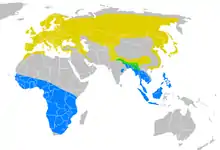 | زرد: کمینه یک گونه تولید مثل میکند آبی: کمینه یک گونه زمستانگذرانی میکند سبز: چلچله خانگی نپال در همهٔ طول سال حضور دارد. | |