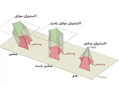 برای ساختن یک منشور میتوان از اکستروژن موازی بهره برد. در اکستروژن موازی رئوس چندضلعی B در صفحهٔ p در راستای خطوطی موازی کشیده میشوند.[21]منشور یکی از خانوادهای منشوروار است.