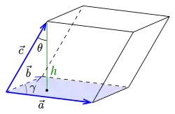 - روابط: از آنجا که متوازی السطوح منشوری ناقائم با قاعده متوازی الاضلاع است، بنابرین حجم برابر با حاصل ضرب مساحت قاعده S در ارتفاع h است.