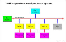 سیستمهای SMP با سیستمهای چندپردازنده به هم وابسته با محفظهای از پردازندههای همسان به صورت مستقل از یکدیگر عمل کنند. هر پردازنده، با اجرای برنامههای مختلف و کار در مورد مجموعههای مختلف دادهها قابلیت به اشتراکگذاری منابع متداول را دارد که به کمک یک پایانه سیستمی یا یک خط عرضی به هم متصل شدهاند و تقریباً مقیاسپذیری خطی را برای شمار زیادی از پردازندهها در پرتوی برنامهپذیری فراهم میکند: