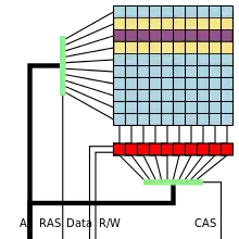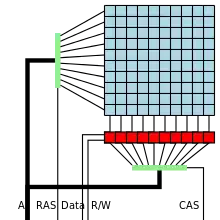 سلولهای حافظه (مربعهای آبی در تصویر) بیشتر به شکل ماتریسها سازماندهی و از طریق سطرها و ستونها آدرس دهی میشوند. یک آدرس حافظه که برای یک ماتریس استفاده میشود به آدرس سطر و ستون تقسیم میشود، که به وسیله آدرس سطر و سپس آدرس ستون به ترتیب پردازش میشوند (در تصویر، به ترتیب مستطیلهای عمودی و افقی سبز نشان داده شدهاست). یک آدرس ردیف، ردیف را برای یک عملیات خواندن انتخاب میکند (به عنوان فعالسازی ردیف نیز شناخته میشود)، بیت از تمام سلولهای موجود در ردیف به تقویت کنندههای حس منتقل میشود که بافر ردیف را تشکیل میدهند (مربعهای قرمز در تصویر) که در آن بیت دقیق با استفاده از آدرس ستون انتخاب میشود. در نتیجه، عملیاتهای خواندن دارای یک ماهیت مخرب هستند، زیرا طراحی DRAM به سلولهای حافظه نیاز دارد تا پس از آنکه مقادیر آنها با انتقال بار سلول به بافر سطر خوانده شد، بازنویسی شوند. عملیات نوشتن آدرسها را به روشی مشابه رمزگشایی میکند، اما در نتیجه دراین طراحی باید تمام ردیفها بازنویسی شوند تا مقدار یک بیت واحد تغییر یابد.[1][2][3][11][12][13]