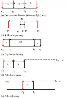 بطورکلی، وضعیت قرارگیری الکترودها به صورت خطی برای اندازهگیری مقاومت مورد استفاده قرار میگیرد. آرایش رایج الکترودها به صورت «شِلِمبِرژر»، «وِنِر»، «بسط دوقطبی-دوقطبی» میباشد که در شکل زیر ملاحظه میفرمایید. با توجه به مزیتهای روش تجربی و منظم، برای اجرای سونداژ الکتریکی عمودی اغلب از آرایش متقارنِ «شلمبرژر» استفاده میکنند.
