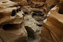 جزیرهٔ قشم که به شکل دلفین در تنگهٔ هرمز در سواحل جنوبی ایران واقع است دارای تشکیلات زمینشناختی منحصر به فردی است که در اثر فرسایش ایجاد شده و مناطقی بسیار زیبا و دیدنی به شکل بیابانهای سنگی ایجاد کردهاست.[2]