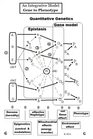 The metabolic pathways from gene to phenotype are complex and varied, but the causes of correlation amongst attributes lie within them. An outline is shown in the Figure to the right.