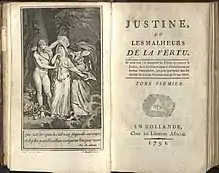 این رمان با عنوان «بدبختیهای اخلاق» اخیراً چاپ شده اما اولین بار مارکی دوساد آن را با عنوان «ژوستین» منتشر کرد.