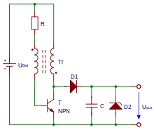 این مدار نوعی نوسان دهنده است که یک مبدل تقویت کنندهٔ ولتاژ بدون کنترل را تشکیل میدهد. ولتاژ زیاد در خروجی به ازای جریان زیاد در ورودی حاصل میشود، در حالی که جریان یکپارچه (متوسط) در خروجی کم است.