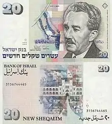 تصویر پشت اسکناس ۲۰ شِکِلی اسرائیل با طرحی از ژیمناسیوم عبری هرتزلیا.
