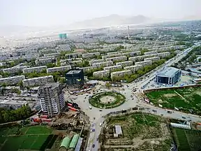 در طی دهههای ۱۹۴۰ و ۱۹۵۰، شهرنشینی شتاب گرفت و مساحت ساخته شده تا سال ۱۹۶۲ به ۶۸ کیلومتر مربع افزایش یافت، که تقریباً چهار برابر افزایش نسبت به سال ۱۹۲۵ بود.[27] در نخستوزیری محمد داود خان در دهه ۱۹۵۰، سرمایهگذاری و توسعههای خارجی افزایش یافت. در سال ۱۹۵۵، اتحاد جماهیر شوروی ۱۰۰ میلیون دلار اعتبار به افغانستان ارسال کرد، که برای توسعه و ساخت حمل و نقل عمومی، فرودگاهها، یک کارخانه سیمان، نانوایی مکانیزه، یک بزرگراه پنج بانده از کابل تا مرز شوروی و بندها، از جمله گذرگاه سالنگ به شمال کابل را شامل میشد.[33] در طول دهه ۱۹۶۰، خانههای مسکونی مکروریان به سبک شوروی ساخته شد که شامل شصت بلوک بود. دولت همچنین بسیاری از ساختمانهای وزارتخانه را به سبک معماری بروتالیست ساخت.[34]