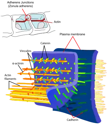 فعلوانفعالات اصلی پروتئینهای ساختاری در محلِ اتصال و چسبندگی سلولی وابسته به کادهرین. اینگونه کادهرینها دقیقاً به چه وسیلهای به رشتههای نازک اکتین متصل هستند، همچنان در دستِ تحقیق و بررسی است.[1]