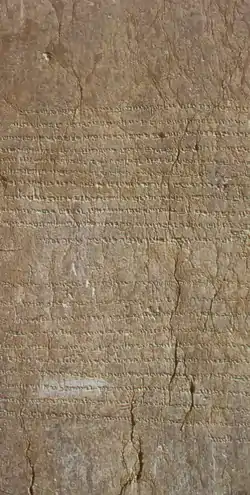 خدای بزرگ اهورامزدا است که این جهان را آفریده، که آن آسمان را آفریده، و خوشبختی را آفریده، که مرا، اردشیر، شاه کرده، یگانه شاهی از بسیاری، یگانه فرمانروایی از بسیاری، گوید اردشیرشاه بزرگ، شاه شاهان، شاه کشورها، شاه این سرزمین: من پسر اردشیر (دوم) شاهم، اردشیر شاه پسر داریوش (دوم) شاه بود، داریوش شاه پسر اردشیر (یکم) شاه بود، اردشیر شاه پسر خشایارشا شاه بود، خشایارشا شاه پسرداریوش شاه بود، داریوش شاه پسر ویشتاسپه بود، ویشتاسپه پسر آرشامه، از تخمه هخامنشی. گوید اردشیرشاه: این پلکان سنگی را من ساختم. گوید اردشیرشاه: بادا که اهورامزدا و ایزدمهر مرا بپایند و این کشور را و آنچه را بر دست من کرده شد.[4]