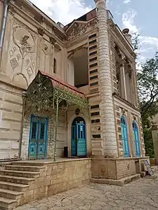 این ساختمان بنایی است که به صورت قرینه ساخته شدهاست. معماری نیمی از آن ایرانی و نیمی از آن خارجی است و در حقیقت معماری تلفیقی دارد. قسمت ایرانی با ظرافت و به وسیله نقوش گل و بوته و مردان دوره قاجار و قسمت فرنگی نیز با کاغذ دیواری خانههای روسی متعلق به قرن نوزدهم و البته نقش و نگارهای اروپایی به زیبایی هر چه تمامتر تزیین شدهاست. در نمای خارجی بنا، مجسمههای گچی وجود دارند که سردرها و نردههای گچی لبه بام را تزیین کردهاند.