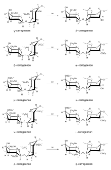 به صورت نمکهای مختلف یا نمکهای مخلوط استر سولفات وجود دارد به انواع کاپا، آیوتا و لامبدا تقسیم میشود، که هر کدام حلالیت و خواص ژلکنندگی متفاوتی دارند نوع کاپا و آیوتا درآب داغ (حرارت بالاتر از ۷۱ درجه سانتی گراد) حل میشوند و به ترتیب در حضور کاتیونهای پتاسیم و کلسیم ژلهای قابلبرگشت تشکیل میدهند. ژلهای حاصل از نوع کاپا شکننده بوده و حالت تراوش بیشتری از خود نشان میدهد. درحالیکه ژلهای آیوتا کشسانی و کشش بیشتری داشته و حالت تراوش و سینرسیس از خود نشان نمیدهند. نوع لامبدا در آب سرد محلول است ولی ژ ل تشکیل نمیدهد. کاپا و آیوتا کاراگینان با پروتئینهای شیر واکنش نموده و همراه با سایر صمغها از تراوش آب یا سرم شیر به بیرون جلوگیری میکنند. مقدار ۱٪ تا ۳٪ درصد آن باعث تثبیت پروتئینهای شیر میشود و در غلظت ۵/۰ تا ۱ درصد ژل تشکیل میدهد. در فراوردههای لبنی، دسرهای ژلهای و ژلههای کم کالری مصرف میشود. درسیستمهایی که محیط آن را آب تشکیل میدهد ۲/۰ تا ۱ درصد و درسیستمهای شیر ۰۱/۰ تا ۲۵/۰ درصد کاراگینان توصیه میگردد.