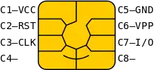 VPP: برای دو حالت ISO/IEC 7816-3:1997 مخصوص ولتاژ برنامهنویسی (ورودی ولتاژ بالا برای برنامهنویسی حافظه بلند مدت) و ISO/IEC 7816-3:2006 برای استفاده اختصاصی یا استاندارد (SPU, standard or proprietary use).
