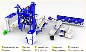 اجزای یک کارخانه ساخت آسفالت. ۱. سیستم تغذیه شن و ماسه سرد ۲. خشک کن درامی ۳. بالابر شن و ماسه گرم ۴. صفحه لرزاننده ۵. سیستم وزن کنی ۶. برج اختلاط ۷. ردگیر ۸. سیستم تغذیه فیلر ۹. سیستم تغذیه قیر ۱۰. سیستم کنترل الکترونیک