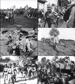 ![]() جهت عقربههای ساعت از بالا به سمت چپ: چیانگ کای شک در حال بازرسی سربازان ارتش ملی انقلابی است. سربازان NRA به سمت شمال حرکت میکنند. یک واحد توپخانه NRA در جنگ. غیرنظامیانی را که از NRA حمایت میکنند شامل دهقانان داوطلب را برای پیوستن به این همراهی میکنند. سربازان NRA در حال آمادهسازی برای حمله هستند. | |||||||
