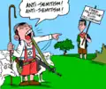پیروی از دستورات' 'توسط کارلوس لاتوف اعضای نازی را در مقایسه با سربازان اسرائیلی توصیف می کند که "برای کشتن متولد شده اند". متنی به شکل صلیب شکسته می گوید: "سربازان اسرائیلی فقط از دستورات پیروی می کنند"