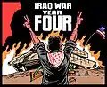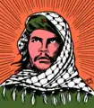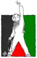 'انتفاضه جهانی' 'توسط لاتاف یک' شخصیت جهانی 'را نشان می دهد که چفیه را می پوشد ، و علامت V را با دست چپ درست می کند و تیرکمان بچه را در دست راست گرفته است. ، در مقابل پرچم فلسطین