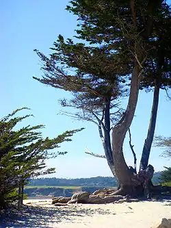 ![]() View towards the city's white-sand beach, Carmel-by-the-Sea; an old Monterey Cypress in the foreground | |