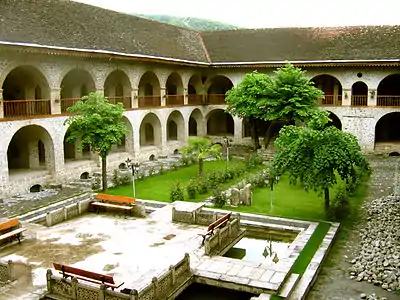 بهدلیل اینکه شکی از شهرهای تجاری و صنعتی قدیمی آذربایجان بودهاست، کاروانسراهای زیادی در این شهر احداث گردیدهبودهاست. در قرون ۱۸ تا ۱۹، ۵ قلم کاروانسرا نظیر کاروانسراهای «اصفهان»، «تبریز»، «لزگی»، «ارمنی» و «کاروانسرای تازه» در شکی وجود دشتهاند، که ۲ تا از آنها – کاروانسرای «یوخاری» (بالا)، و کاروانسرای «آشاغی» (پایین) باقی ماندهاند.[5]