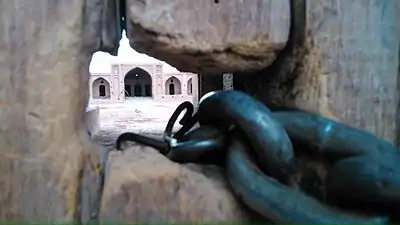 ![]() نمایی از داخل حیاط کاروانسرا از حفرهٔ درب قفل شده ورودی | |