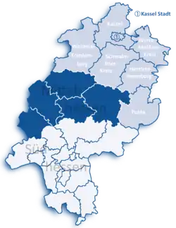 ![]() نقشهٔ ایالت هسن؛ قسمت روشنشده، منطقهٔ دولتی کاسل (منطقه) را نشان میدهد. | |
